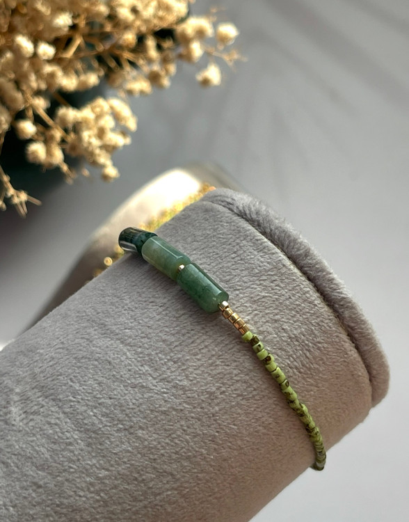 دستبند تک رج ترکیب منجوق و سنگ طبیعی عقیق خزه ای هست