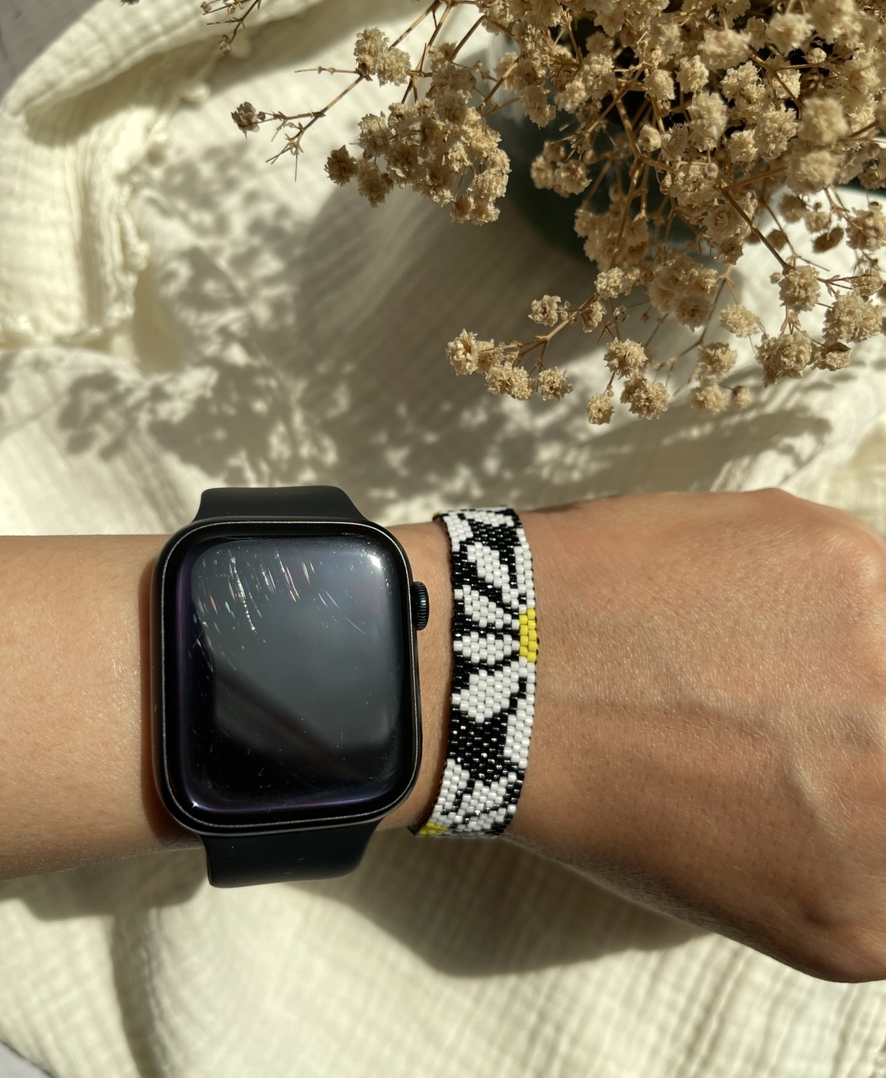 ✅این دستبند جذاب با منجوق با کیفیت ژاپنی میوکی بافته شده ✅کل کار بافته شده با دست و عشق فراوان هست ✅تمامی ایتم ها به سلیقه و سایز شما قابل تغییر است ✅اکسسوری اضافه شده از جنس استیل ضداب و ضدحساسیت هست ✅طول دستبند حدود ۱۳-۱۴ سانت و بند کشویی دارد